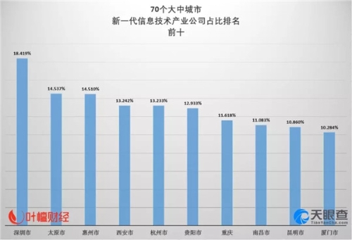 最近,知名大号叶檀财经推出了中国十大创新力城市系列,评选出最有潜力、排名靠前的创新城市,在其中一项关于新一代信息技术产业公司占比的城市排名中(如下图所示),昆明在70个大中城市(不含北上广)中排在第9位,反映出昆明在高新技术领域特别是信息产业方面的长足进步。