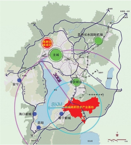 昆明高新技术产业开发区成立于1992年,2006年,呈贡区设立新城高新技术产业基地,由高新区托管,占地约86.88平方公里,从此以后呈贡多了一个高新东区。