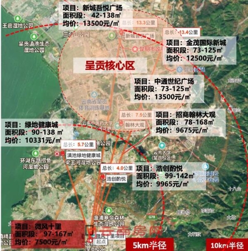 把图放大,我们可以看到呈贡高新区和呈贡以及周边几个热门板块的位置关系和房价落差。