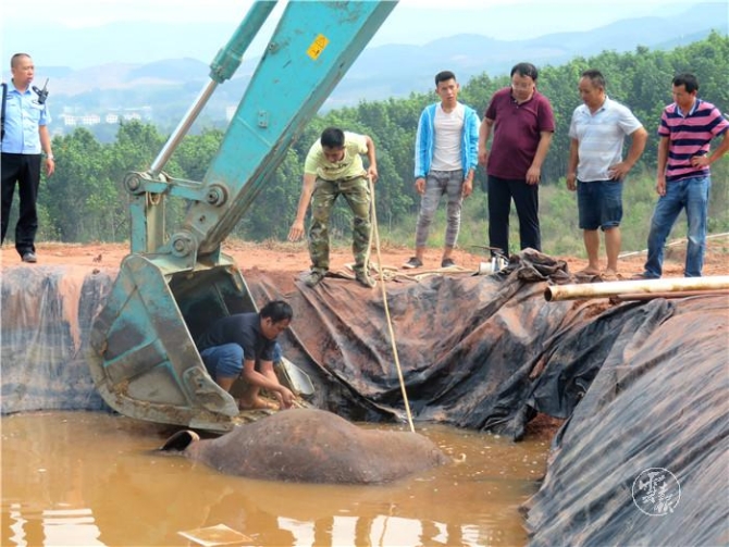 6月8日晚上8点30分,一群由11头亚洲象组成的野象群景在洪市景讷乡曼散村委会曼勐新寨旁柚子种植基地活动时,被发现有3头野象(2大1小)落入了3.5米深的蓄水池中。