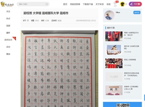 昆明信息港讯 记者马文焘 日前,“云岭杯”云南省2019年中华经典诵写讲大赛三项赛事的报名参赛阶段均已正式结束。截至6月3日,大赛得到了近万名来自全省16州市的老师、学生及社会人员参与,并有4695件作品成功进入评审阶段。