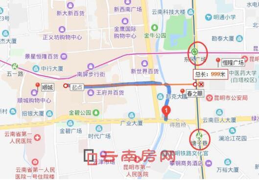 东风广场商圈兴起,地铁扮演了非常重要的角色。在宝善街盘龙段和北京路交叉口,分布有地铁1号线、2号线、3号线、6号线等多条线路,其中距此不远的塘子巷站是昆明换乘线路最多的站点。未来城市商圈发展与地铁的关系非常大,东风广场区域密集的地铁线路和多个换乘站,为商业开发带来了非常有利的条件,这也是恒隆当初拿下昆明地王,SKP弃五一路地块转投春之眼的主要动因之一。