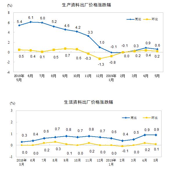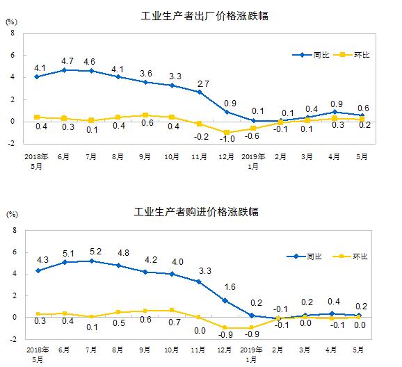 记者从国家统计局获悉,2019年5月份,全国工业生产者出厂价格同比上涨0.6%,环比上涨0.2%;工业生产者购进价格同比上涨0.2%,环比持平。1—5月平均,工业生产者出厂价格比去年同期上涨0.4%,工业生产者购进价格上涨0.2%。