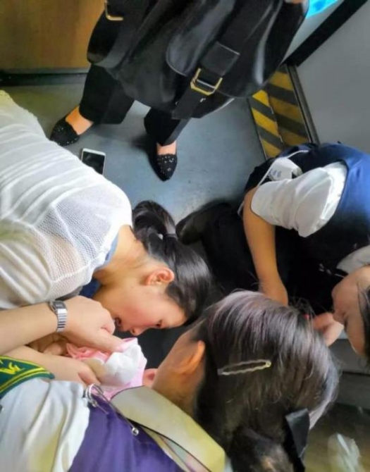 来到11号车厢后,金佳慧看到一名约1岁大的幼儿面色发白,已经窒息。情况紧急,条件有限,她立即将幼儿趴在自己腿上,运用海姆立克急救法进行施救。