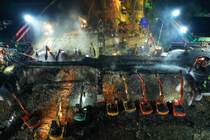 据此次工程承建单位介绍,为了保证在最短时间内高质量完成施工,现场调集了镐头机、挖掘机等50台大型设备。“拆除作业集中在长50米、宽24.5米的桥面上,在这么狭窄的范围内集中几十台镐头机同时作业,犹如同时指挥几十条手臂在一小块布上‘穿针引线’,需要高度协调。” 项目相关负责人介绍。