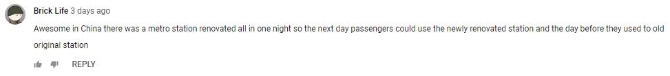 另一名网友“Brick Life”似乎对“中国速度”早有耳闻,他点评道:“太棒了,中国有一个地铁站在一夜之间翻新完毕,所以前一天乘客们还在使用旧的地铁站,第二天就可以使用刚刚翻新的地铁站了。