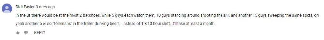 网友“Didi Faster”形象地写道:在美国,最多有两台挖土机,每台挖土机要5个人看管,10个人站在旁边侃大山,另外15个人在原地不停地‘扫地’。哦,对了,还有5个左右的‘工头’在拖车里喝啤酒。而不是8-10小时的轮班制,所以在美国这件事至少需要一个月的时间。