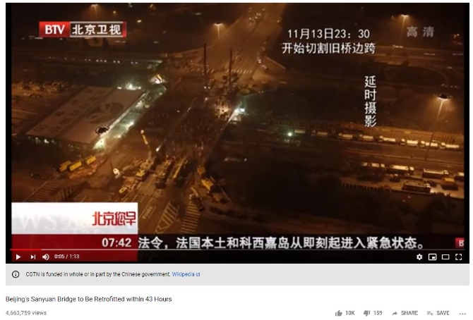 三元桥“旧桥换新桥”的报道视频在YouTube上的播放量超过400万。图片来源YouTube网站截图
