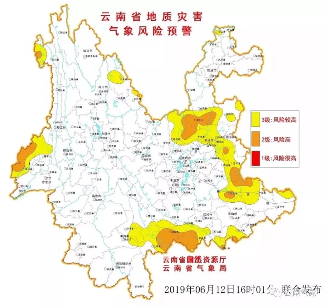 预计,2019年06月12日20:00~06月13日20:00,滇东北曲靖,滇西北怒江,滇西德宏、保山,滇西南普洱,滇南红河,滇东南文山及昆明部分地区发生滑坡泥石流的风险高。