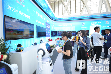 昆明信息港讯 (昆明日报 全媒体记者李思凡) “小云,今天石林的天气怎么样?”“石林中雨,中级风,小心迷伤眼镜。预计气温19至27摄氏度,此刻25摄氏度。空气质量超赞,心旷神怡啊!怕你淋湿,记得带伞。”在本届商洽会5G展示区,“游云南”App人工智能机器人“小云”“小南”从线上来到线下,吸引观展者与它们互动。