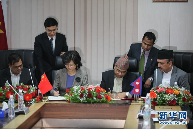 2017年5月12日,在尼泊尔加德满都,中国尼泊尔签署“一带一路”合作备忘录。新华社记者周盛平 摄