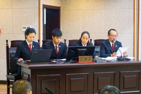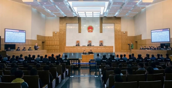 2018年12月5日,云南省昆明市晋宁区检察院检察长朱立(右一)带领公诉团队对桂元浩等11人涉黑案出庭支持公诉。