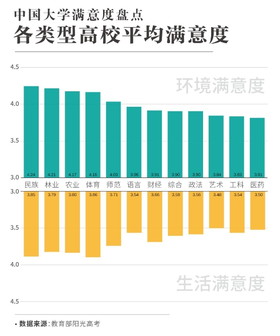 选择学医的同学就没有那么好运了。无论是环境还是生活,医药类院校的满意度指标都位于尾部,似乎证实了“医学院的生活条件总是不太好”的民间观点。与它们相伴的还有艺术类院校与工科类院校这两个难兄难弟。