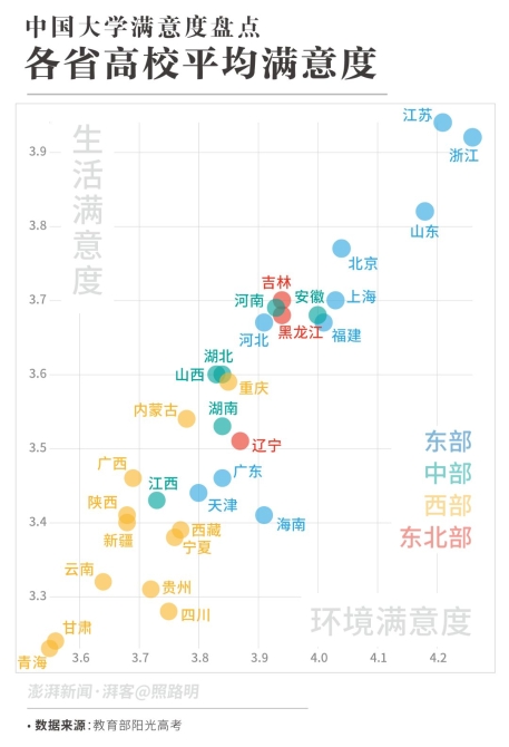 从省份和类型两个维度来看,中国大学所获得的满意度评价也呈现出不同的特点。