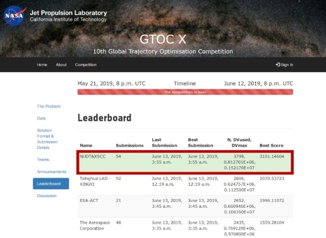 据国防科技大学官微发布的消息,在昨天凌晨四点结束的第十届国际空间轨道设计大赛(GTOCX)中,国防科大代表队实现了中国参赛队伍的首次夺冠,一举打破了欧美参赛队对该赛事冠军的垄断。