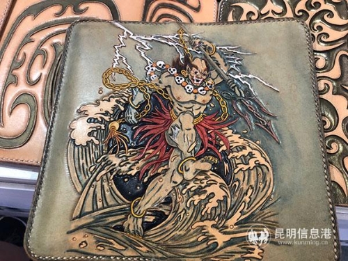 非遗文化展区里的皮雕钱包。记者曹月/摄
