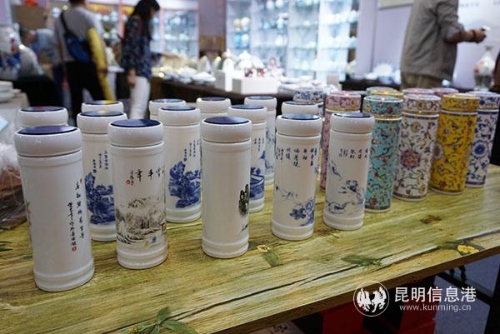 境内展馆里来自景德镇的陶瓷保温杯。记者劳学丽/摄