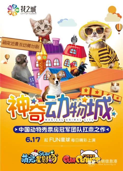昆明信息港讯 家里的萌宠竟然可以演戏?!2019年6月16日,昆明“花之城·FUN星球”携手中国一线动物表演及训练团队倾力打造的“萌宠星剧场”项目正式启幕。于此同时,作为该项目的重头戏,中国首部萌宠近景互动舞台剧《神奇动物城》首演成功,趣萌逗乐昆明观众。