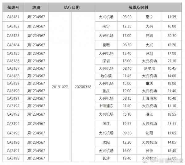 北京日报客户端6月15日消息,国航最新公布了在大兴机场起降的航班。2019年冬春季,国航将在大兴新机场新增部分国内航线航班,大兴始发飞往重庆、浦东、昆明、南宁、哈尔滨、深圳、长沙、沈阳、湛江航线,每天一班。