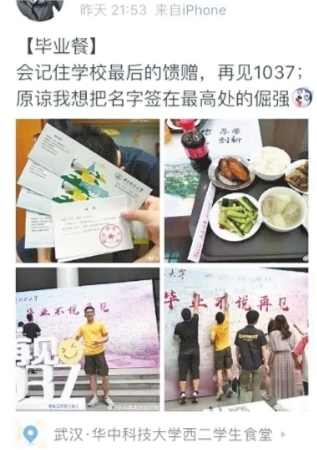 毕业餐的就餐券也是特别设计的,就餐券分为主券和副券,主券可作为毕业留念,就餐时只需携带副券。15日晚本科毕业生就餐,16日晚研究生毕业生就餐。除了上面的各种套餐和米饭,同济校区食堂还为毕业生们提供了可乐以及部分糖果、瓜子、水果。主校区2份套餐都配有饮料自选以及咸蛋、粽子自选。大家纷纷晒照说特别好吃!特别豪华!会记住学校最后的馈赠!(武汉晚报 记者李玉莹 朱佳琪)