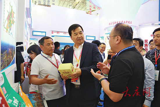 韩立华、何忠华分别来到大庆展区,询问了解企业参展情况,为大庆交易团鼓劲助威。大庆日报记者 孙娜 摄