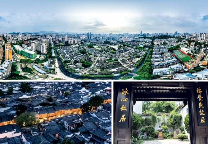 “一片福州三坊七巷,半部中国近代史。”20多年前,在时任福州市委书记习近平主持下,一场抢救林觉民故居的紧急行动,让三坊七巷保住了文脉,留住了乡愁。上图为福建省福州市三坊七巷航拍图(杨素平/视觉中国)。左下图为三坊七巷夜色(陈浩/视觉中国)。右下图为林觉民故居,后被冰心祖父买下。