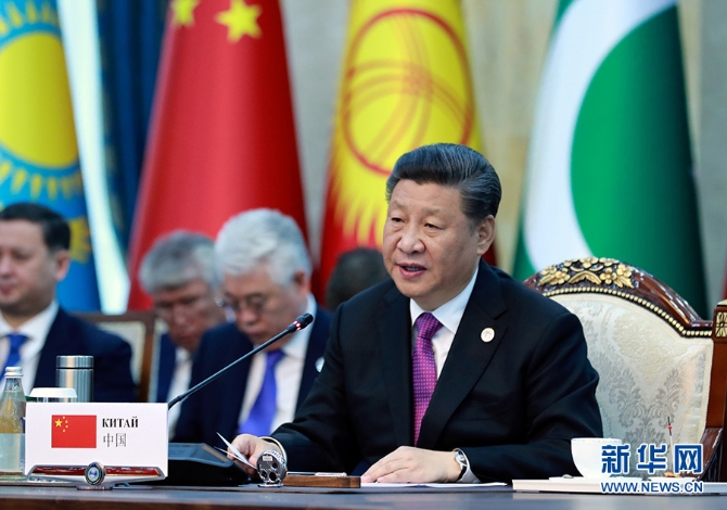 6月14日,国家主席习近平在吉尔吉斯斯坦首都比什凯克出席上海合作组织成员国元首理事会第十九次会议并发表重要讲话。 新华社 记者丁林/摄
