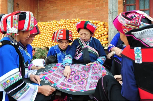彝族(撒尼)刺绣是撒尼人在漫长历史进程中沉积下来的特殊工艺文化,凝结着撒尼人对民族文化、生活价值观念、宗教信仰和对世界的认识,其图案花样搭配丰富,色彩对比强烈,是彝族撒尼人对大自然审美价值的直观反映。