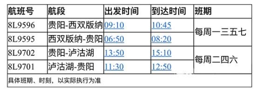 贵阳-西双版纳、贵阳-泸沽湖航班号为8L9595/6、8L9702/1,具体航班信息如下:
