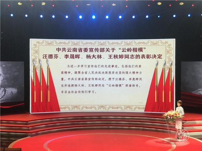 6月19日,省委宣传部在云南广播电视台“云岭楷模”发布厅发布2019年第一批“云岭楷模”先进事迹,授予汪德芬、李晟晖同志,追授杨大林、王秋婷同志“云岭楷模”荣誉称号,号召全社会向他们学习,决战脱贫攻坚。