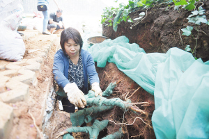 工作人员清除优昙古树腐根并用生长促进剂处理根部。
