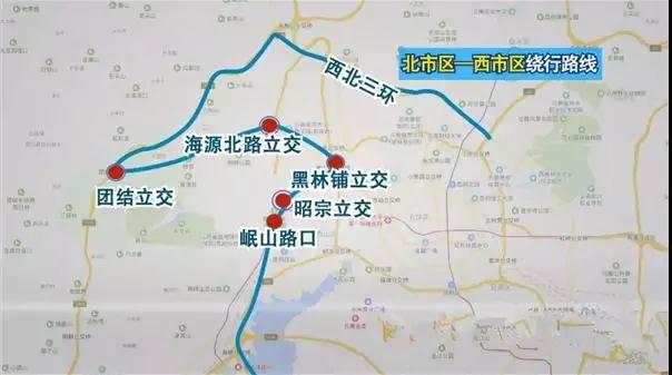 二、从北市区前往西市区的车辆,走西北三环主道到团结立交、海源北路立交、黑林铺立交、昭宗立交、眠山路口再转入其他道路进入西市区。