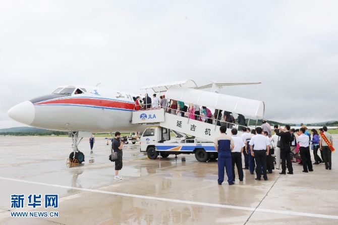 赴朝鲜旅游的游客登机。资料图片来源:新华社 管清江 摄