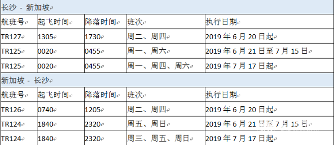 附录:长沙-新加坡航线航班时刻表(2019年6月20日生效)