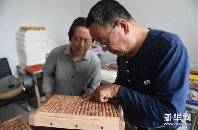 在位于扬州杭集镇自家老屋的工作室内,陈义时(右)在和老伴徐夏娣查看雕刻的“活字”(6月18日摄)。 新华社记者季春鹏/摄