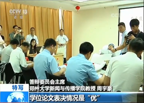 答辩委员会主席 郑州大学新闻与传播学院教授 周宇豪:经答辩委员会全体委员投票表决,程艳芳同学的论文已经达到毕业要求,已经达到硕士学位要求,建议校学位委员会授予硕士学位,学位论文表决情况是“优”。