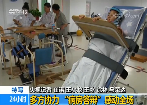 河南省人民医院康复科主副主任 杨阳:以前我们都是让她斜躺30分钟就可以了,但是答辩的时候你想一般人要稍微坐一下的感觉,她答辩的时候要接近40度、50度,我们有电动起立床的一个康复设备,然后让她在这个设备上不断的适应。