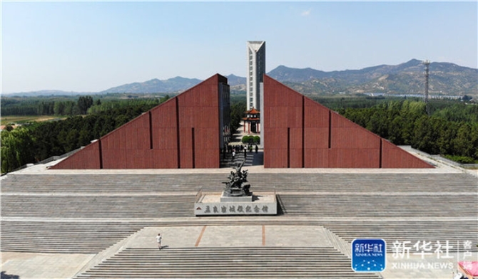 ↑游客在孟良崮战役纪念馆参观(6月9日无人机拍摄)。新华社 记者王凯/摄