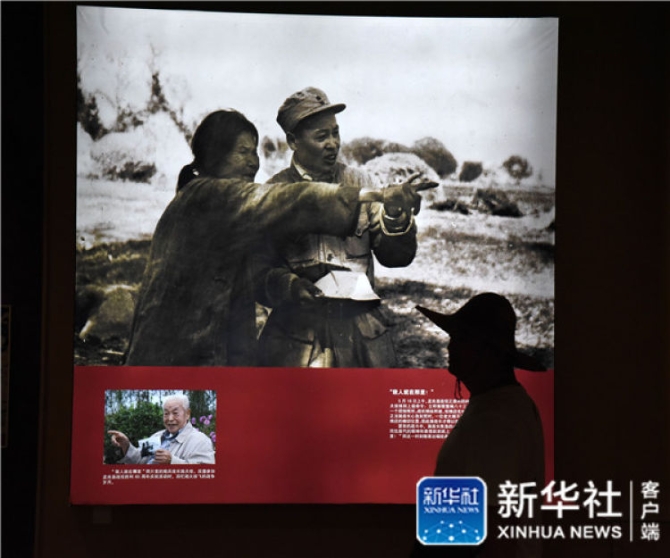 纪念馆墙上,新华社原战地记者邹健东拍摄的一张黑白照片,吸引了众多游客的目光:一位农村老大娘与解放军指战员并肩而立,右手指向远方,画面亲切自然。