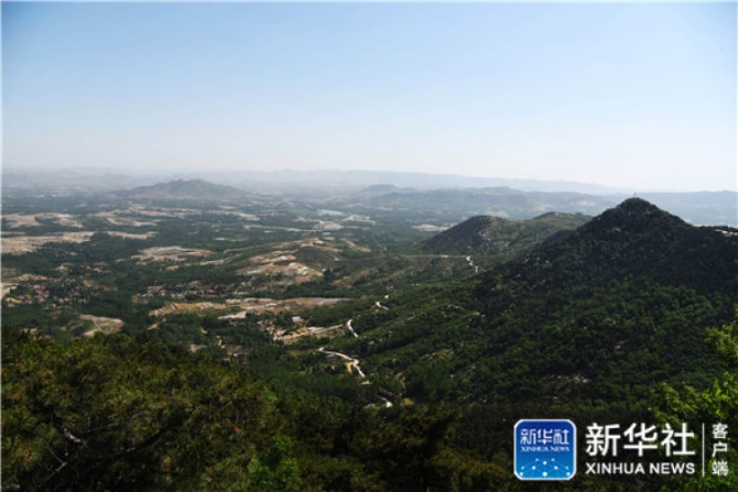 ↑这是孟良崮战役战场遗址。经过几十年的治理,曾经几乎寸草不生的孟良崮如今郁郁葱葱(5月20日摄)。新华社 记者王凯/摄