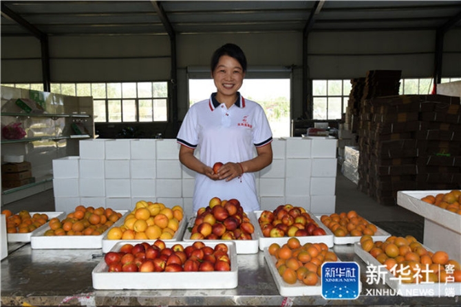 ↑6月10日,在位于蒙阴县的孟良晏园农副产品有限公司,经理牛庆花与自己的水果产品合影。新华社 记者王凯/摄