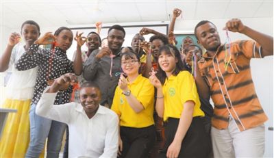 达累斯萨拉姆大学孔子学院的中国文化课堂上,孔院师生与自己制作的中国结合影。记者吕强/摄