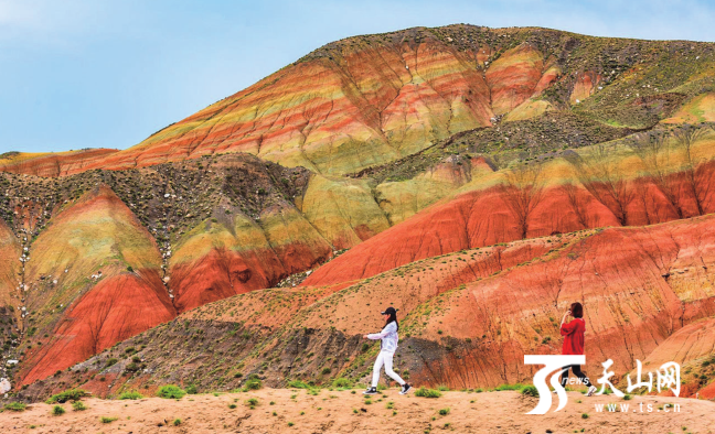 精河县托托镇汇聚了沙漠、胡杨、湿地、丹霞地貌等风光,6月23日,参加“新疆是个好地方·达人西游第6季——踏遍胜景”网络主题传播活动的18位资深旅游达人走进托托镇七彩红山嘴,这里的山体“色如渥丹灿若明霞”,犹如油画。(天山网 记者曹华)
