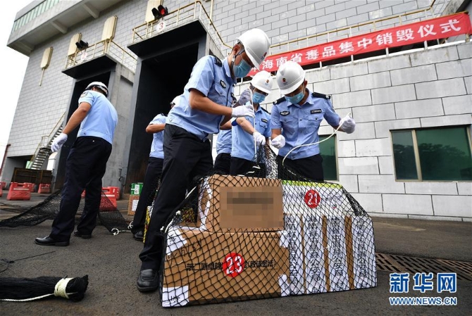 ↑6月3日,在澄迈县老城经济开发区海口焚烧发电厂,工作人员准备销毁毒品。 当日,海南省公安厅、海南省禁毒办联合在海南澄迈县老城经济开发区海口焚烧发电厂举行集中销毁毒品仪式,集中销毁公安机关缴获并已结案的各类毒品281.63公斤。为减少对环境的污染,此次毒品销毁采用了无害化处理方式。新华社 记者郭程/摄