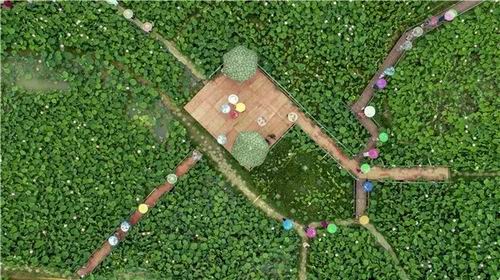 万亩荷花洒在水面,荷叶翠绿,花色多样,亭亭玉立。荡舟穿行其间,清香扑鼻,令人陶醉,如置身于诗画之中。