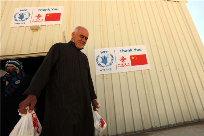 2017年3月5日,在约旦扎塔里难民营,叙利亚难民从联合国世界粮食计划署的仓库中领取中国政府援助的食品。新华社发(穆罕默德·阿布·古什/摄)
