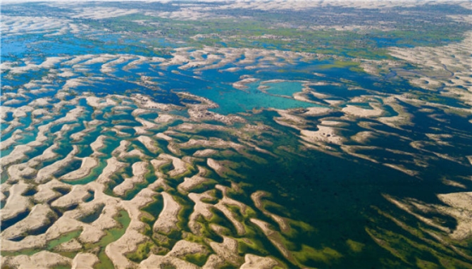 这是库布其沙漠中利用黄河分凌减灾的水进行沙漠生态修复形成的沙漠湿地景色(2018年6月9日无人机拍摄)。新华社记者 彭源/摄