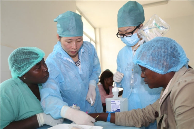 2014年12月10日,在塞拉利昂首都弗里敦,中国人民解放军援助西非抗击埃博拉疫情医疗队为中塞友好医院开展输液培训活动。新华社发(戴欣/摄)