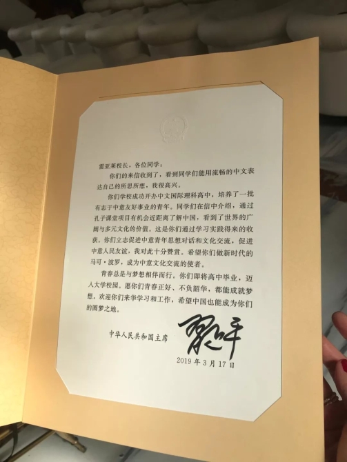 今年3月,在出访意大利前夕,习近平给意大利罗马国立住读学校师生回信。他在信中说,看到同学们能用流畅的中文表达自己的所思所想,我很高兴。