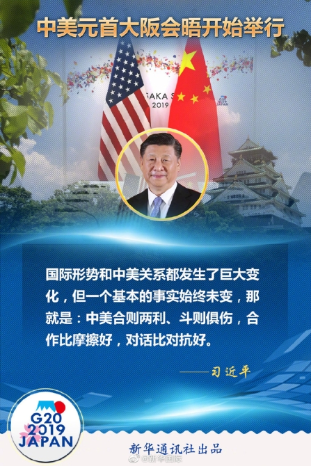 习近平在会晤开始时说,很高兴同总统先生在大阪见面。48年前,也就是1971年,就在离这里100多公里的名古屋,参加第三十一届世界乒乓球锦标赛的中美乒乓球运动员进行了友好互动,这就是后来人们说的“乒乓外交”的开启,创造了“小球转动大球”的历史佳话。8年之后的1979年,中美建立了外交关系。回顾建交以来的40年,国际形势和中美关系都发生了巨大变化,但一个基本的事实始终未变,那就是:中美合则两利、斗则俱伤,合作比摩擦好,对话比对抗好。近来,我同总统先生通过电话和书信保持着密切联系。今天,我愿同总统先生就事关中美关系发展的根本性问题交换意见,为下阶段两国关系发展定向把舵,推进以协调、合作、稳定为基调的中美关系。